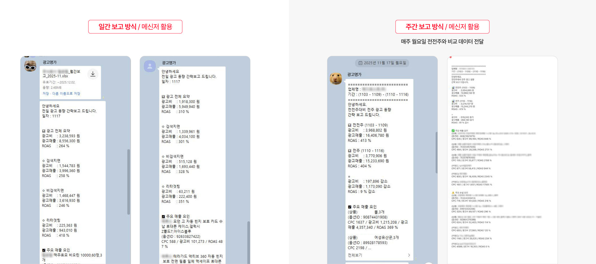 광고 동향 체크 및 운영 방안을 메신저와 보고서를 활용하여 전달하고 있습니다.